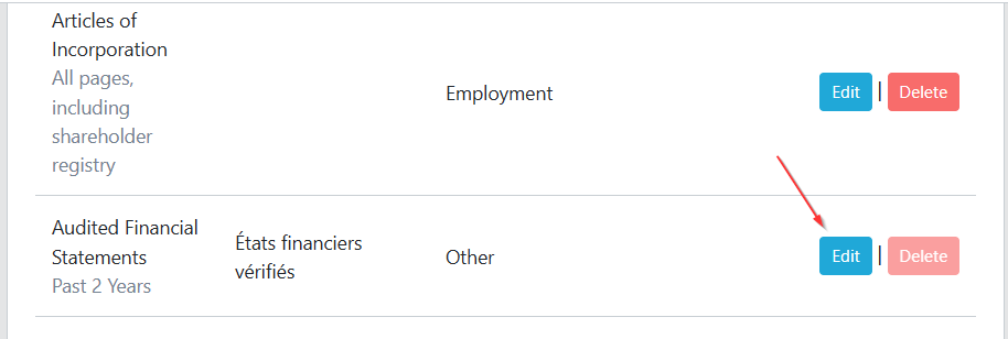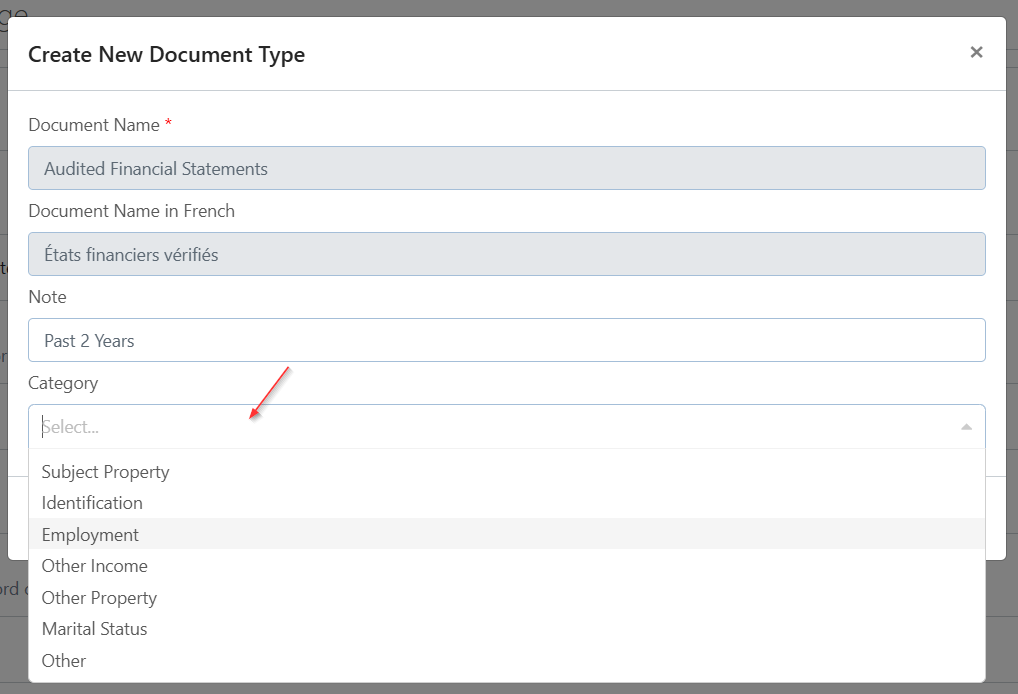 4) Enter the document name in English and/or French, and any note you wish to display to explain what is needed for that document. Select the Category for the document so that it will be available within the Applicant Portal "Add Document" section.