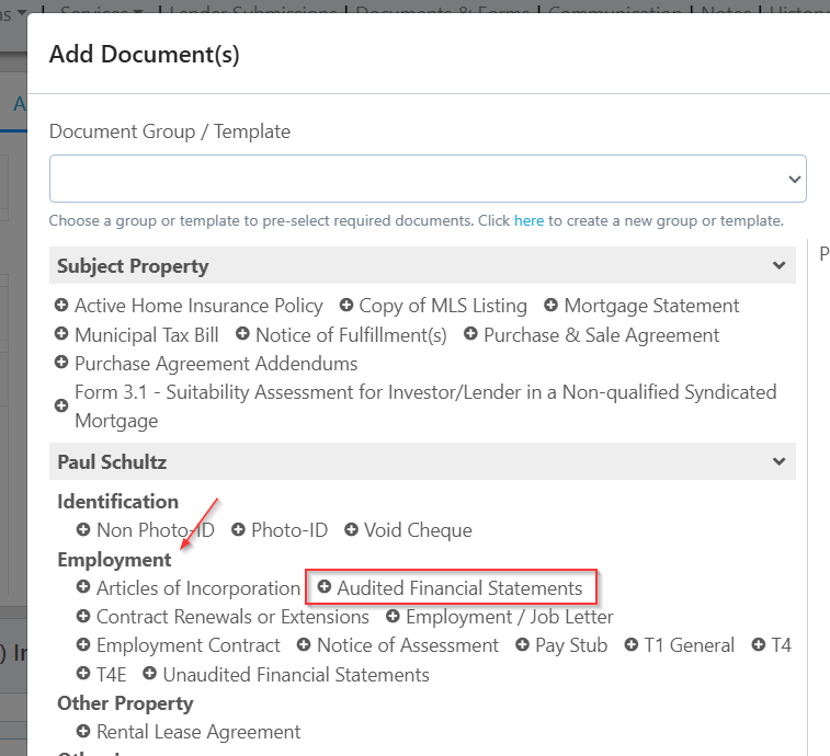 4) This screen will show you which documents are automatically requested based on the deal contents. If the deal is a Refinance, as an example, the documents under the Refinance Deal bucket would be included in the auto-doc request, as well as any other categories which applied to the deal.