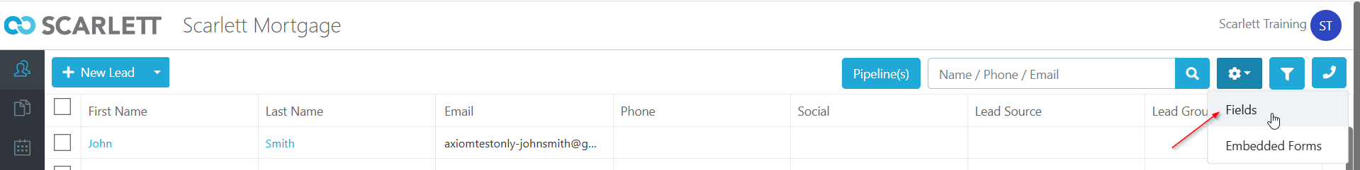 1) From within your leads dashboard, click the gear icon and select fields.