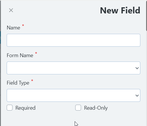 3) This will open the create screen where you can name the field, add it to a specific form section, and set the field type.