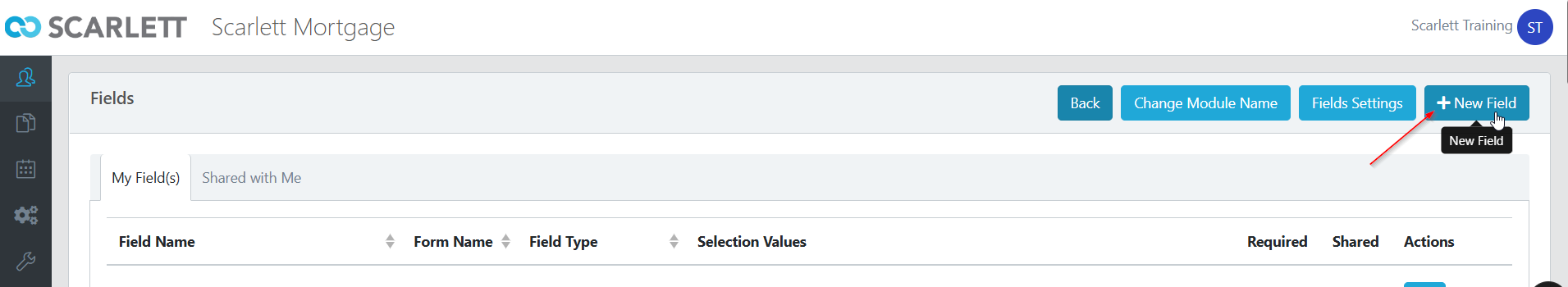 2) This will show a list of existing fields. You can create a new custom field by clicking "New Field"